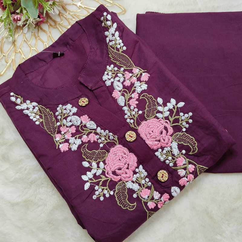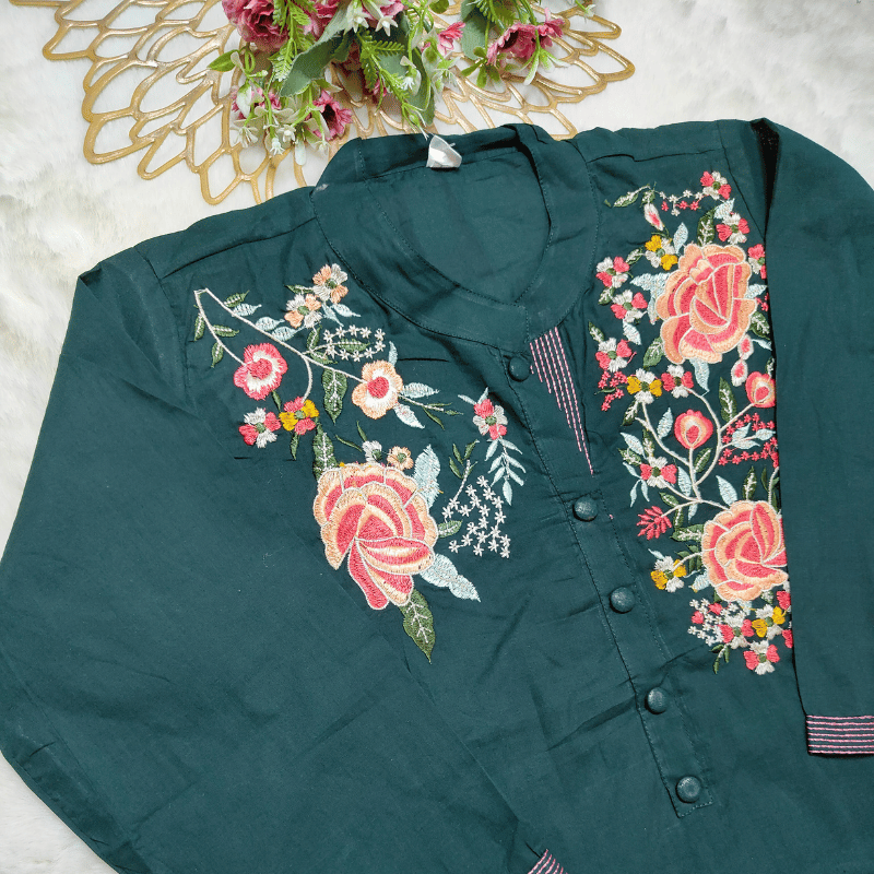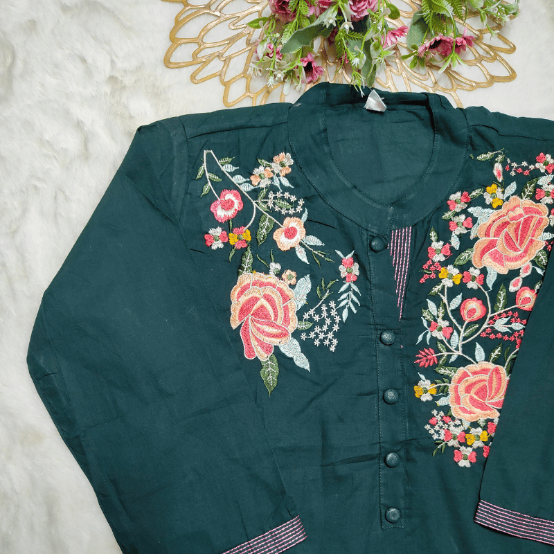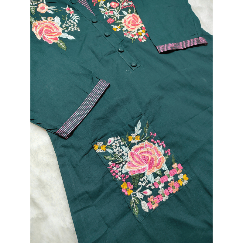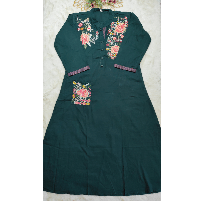Pattern: The dress in the image is a dark green, A-line kurti with colorful floral embroidery on the chest and pocket areas.