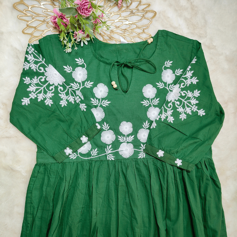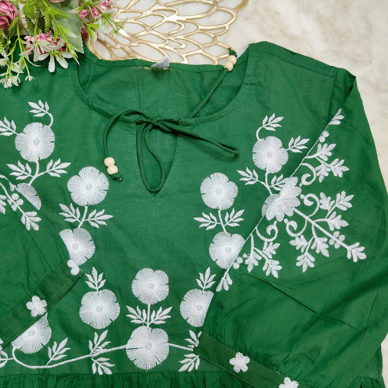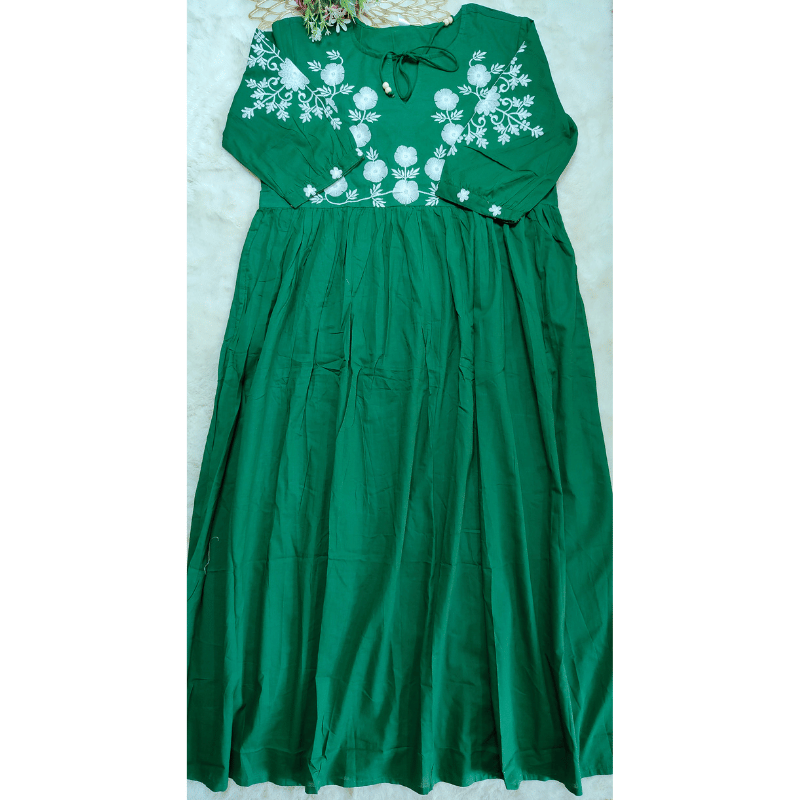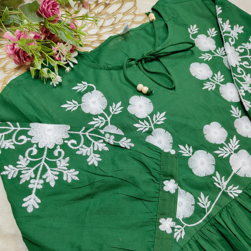 Pattern: a green flared dress with heavy white floral embroidery on the bodice and sleeves, fitted waist, and voluminous gathered skirt.