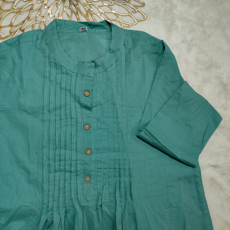 Pattern: mini tucks on the front chest area and heavy embroidery pattern on the bottom .
