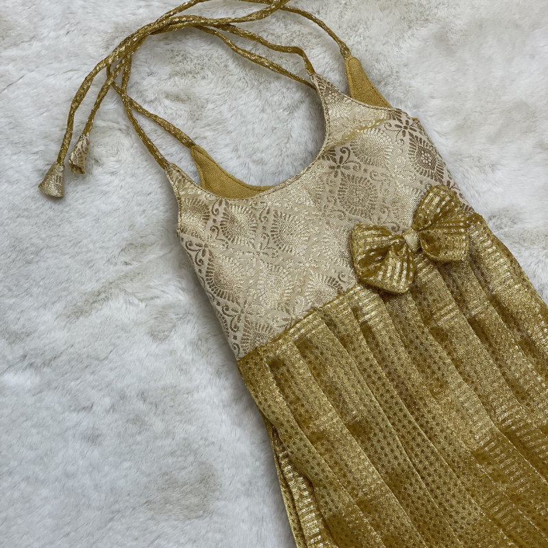 It sounds like you're describing a cute outfit! Yellow with red and green floral design paired with white lace sounds vibrant and cheerful, perfect for a girl's attire.